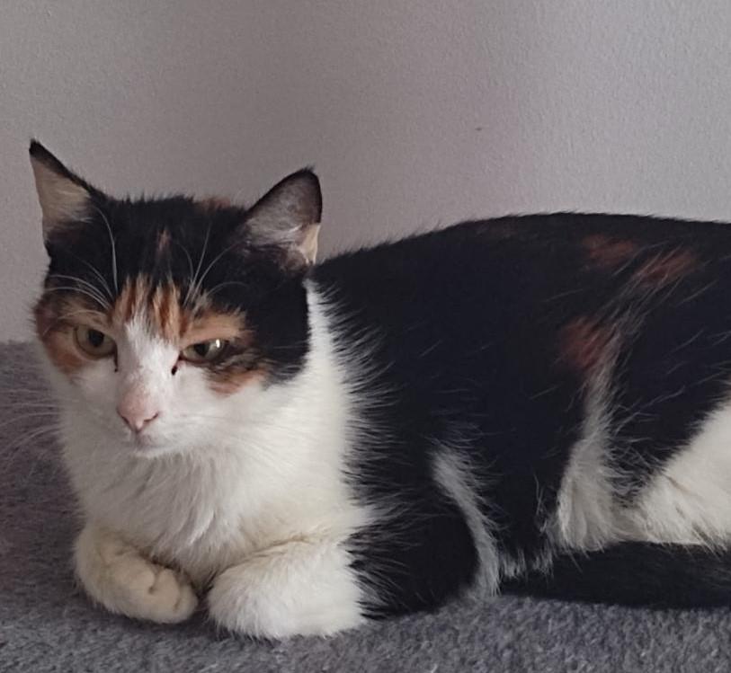 Lisa (âge estimé : ~2 ans), femelle calico, identifiée et stérilisée, FIV négatif.